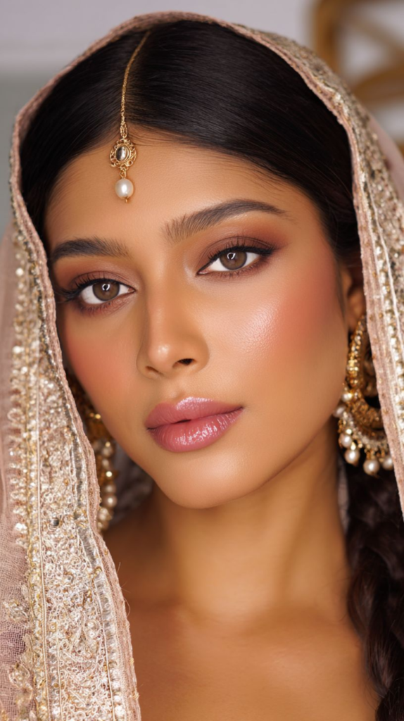 Cream blush in peachy nudes and warm rose tones, swept high on the cheekbones, gives every bride that flush of genuine joy. It reads beautifully across all Indian skin tones and flatters every wedding palette. The lip stays intentional and understated — satin, refined, and timeless. This is what radiant bride makeuptruly looks like.